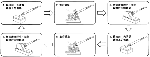 這可以減低烙鐵頭的氧化機(jī)會,使烙鐵頭更耐用。使用后,應(yīng)待烙鐵頭溫度稍為降低后才加上新焊錫,使鍍錫層有更佳的防氧化效果。(圖5)