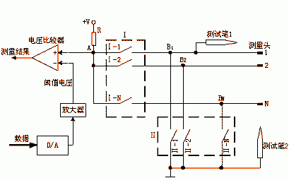 實(shí)現(xiàn)自動(dòng)測(cè)量的前提是將被測(cè)元件引腳連入探測(cè)電路中,為此探測(cè)設(shè)備設(shè)置若干個(gè)測(cè)量頭,通過電纜引出,測(cè)量頭可掛接各種測(cè)試夾具與元件引腳建立連接,測(cè)量頭的數(shù)量決定了同一批連入探測(cè)電路的引腳數(shù)。然后在程序控制下探測(cè)儀按組合原則依次將被測(cè)"引腳對(duì)"一一納入測(cè)量通路。在測(cè)量通路中將"引腳對(duì)"之間的通/斷路狀況呈現(xiàn)為引腳間有無電阻,測(cè)量通路將其轉(zhuǎn)換為一個(gè)電壓量,由此判斷它們之間的通/斷路關(guān)系并加以記錄。