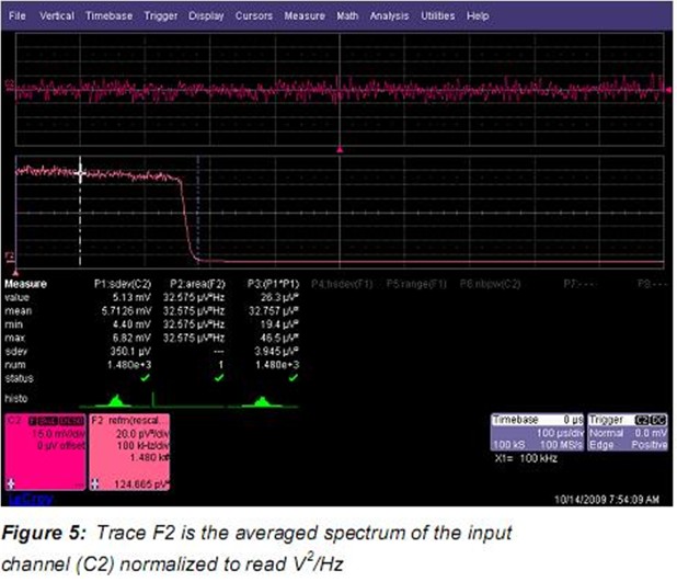 跡線F2中的光標(biāo)讀數(shù)可以直接讀取Figure 5中所示的點(diǎn)功率譜密度。光標(biāo)設(shè)置到100kHz讀數(shù)為 124.665pV2√Hz。