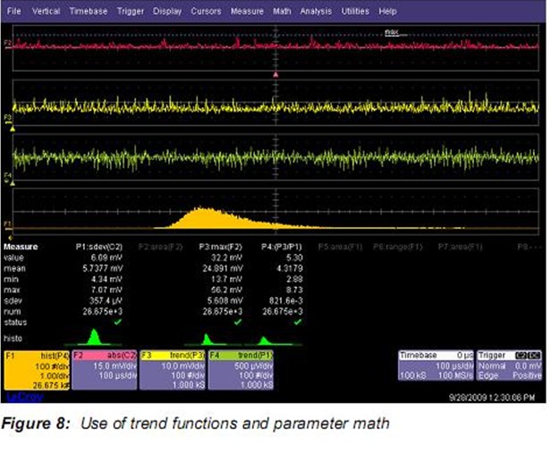 參數(shù)統(tǒng)計(jì)包括最小和最大值。如果想查看采集接著采集的參數(shù)變化可以使用趨勢(shì)功能。趨勢(shì)繪出了每個(gè)測(cè)量值vs 順序事件數(shù)的變化。Figure 8中顯示的函數(shù)跡線F4就是參數(shù)P1的趨勢(shì)。P1是通道C2的標(biāo)準(zhǔn)方差。標(biāo)準(zhǔn)方差參數(shù)每一次采集產(chǎn)生一個(gè)值,而F4順序顯示測(cè)量到的每一個(gè)讀數(shù)。趨勢(shì)圖可以看成一種任意波形,可以使用任何數(shù)學(xué)或測(cè)量工具對(duì)其分析。