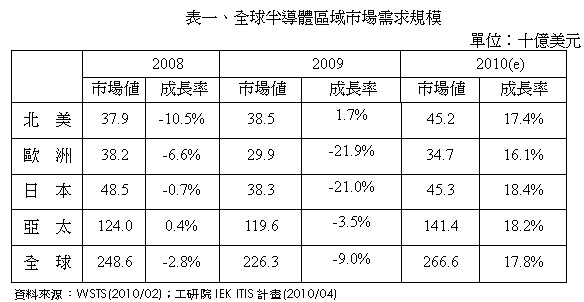2009年全球半導(dǎo)體市場(chǎng)僅北美地區(qū)微幅成長(zhǎng)1.7%,其他皆呈現(xiàn)負(fù)成長(zhǎng):亞太市場(chǎng)衰退3.5%,歐洲市場(chǎng)衰退21.9%,日本市場(chǎng)衰退21.0%。不景氣使得下游電子產(chǎn)品品牌大廠,如Dell、HP、Sony等廠商增加產(chǎn)品委外代工之比例,以降低生產(chǎn)成本,增加其產(chǎn)品競(jìng)爭(zhēng)力。因此,2009年主要從事代工生產(chǎn)之亞太地區(qū),才會(huì)出現(xiàn)僅小幅衰退之情形。至于北美地區(qū)則是因?yàn)槭艿较掠纹放茝S商降價(jià)促銷(xiāo)成功,使得市場(chǎng)呈現(xiàn)小幅成長(zhǎng)。