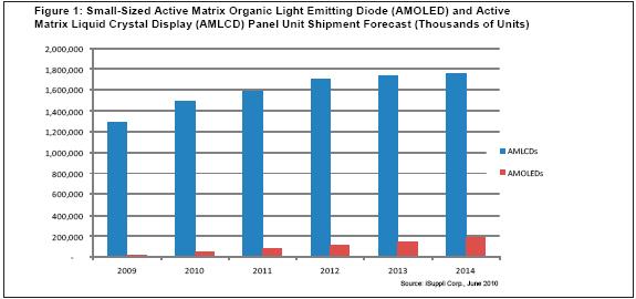 圖1所示為iSuppli公司對(duì)2009-2014年小尺寸AMLCD和AMOLED的出貨量預(yù)測(cè)。iSuppli公司對(duì)小尺寸顯示器的定義是:對(duì)角尺寸小于等于9英寸的顯示器。