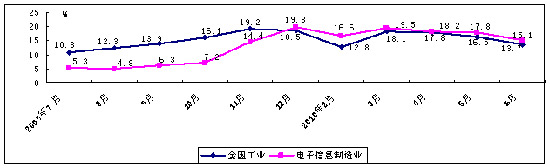 圖1 2009年7月至今規(guī)模以上電子信息制造業(yè)與全國工業(yè)增加值增速對比