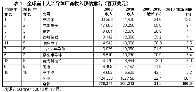根據(jù)全球技術(shù)研究和咨詢公司Gartner的初步調(diào)查,在經(jīng)歷了全球經(jīng)濟(jì)衰退之后,2010年全球半導(dǎo)體市場出現(xiàn)反彈,總收入達(dá)到了3,003億美元,比2009年增長了31.5%。
