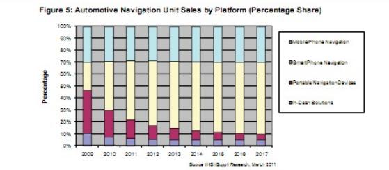 據(jù)IHS iSuppli公司的研究,2011年基于智能手機(jī)的汽車導(dǎo)航系統(tǒng)占汽車導(dǎo)航銷量的比例將接近50%,取代in-dash系統(tǒng)和便攜導(dǎo)航設(shè)備先前占據(jù)的主導(dǎo)地位。
