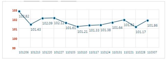 20110307期華強北電子元器件價格指數(shù)報點101.86,比上周上漲了0.69個百分點,上漲幅度為0.68%。