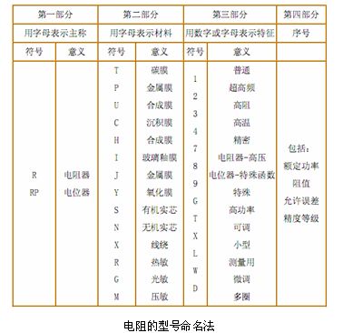 在電子電路中常用的電阻有固定式電阻和電位器,根據(jù)SJ-73標(biāo)準(zhǔn)規(guī)定,電阻器、電位器的命名由四部分組成:第一部分主稱,第二部分材料,第三部分分類特征,第四部分序號(hào)(不適用敏感電阻)。