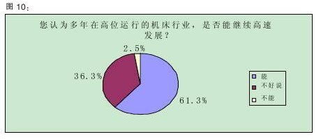 據(jù)年初中國機(jī)床工具工業(yè)協(xié)會(huì)的預(yù)測,2011年機(jī)床行業(yè)總體增幅將大于10%。從本次調(diào)查的情況來看,業(yè)界對(duì)行業(yè)的增長預(yù)期要比協(xié)會(huì)方面直接和樂觀許多,有61.3%的受訪者認(rèn)為,多年來高位運(yùn)行的機(jī)床行業(yè)“能繼續(xù)高速發(fā)展”,而持“不能”態(tài)度的人僅占2.5%(詳見圖10)。