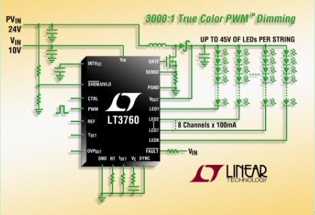 凌力爾特公司 (Linear Technology Corporation) 推出8通道LED驅動器LT3760,該器件采用一個升壓型DC/DC控制器,每個通道能驅動高達45V的100mA LED 串。其內(nèi)部60V、1MHz DC/DC升壓型控制器設計成面向多達80個白光LED的恒定電流LED驅動器。LT3760用一個12V輸入可以驅動8個通道,每通道多達10個串聯(lián)的100mA 白光LED,同時提供超過92% 的效率。其多通道能力使該器件非常適用于中型和大型TFT-LCD背光照明應用。其6V至40V 的輸入電壓范圍使該器件非常適用于汽車、航空電子設備、HDTV 和工業(yè)顯示器應用。