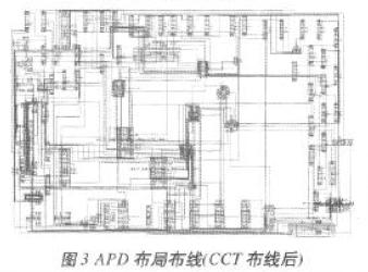 如上所述,MCM布局布線的實現(xiàn)包括電路原理圖生成、擴(kuò)充零件庫及最終的布局布線完成和加工數(shù)據(jù)文件輸出。APD Layout包括Padstack(*.pad)、Package Symbol(*.psm)、Mechanical Symbol(*.bsm)、Format Symbol (*.osm)和Shape Symbol(*.ssm)五種,MCM布局布線設(shè)計中,所有的布局都必須有正確的Library Packing。MCM設(shè)計軟件自帶封裝庫往往不能滿足具體設(shè)計要求,只有擴(kuò)充零件庫后,才能直接調(diào)用零件進(jìn)行布局布線設(shè)計及最終的工藝文件輸出。首先利用Padstack Editor軟件擴(kuò)充零件庫,然后對電路進(jìn)行封裝,并通過Concept HDL給APD軟件導(dǎo)出電連接網(wǎng)表文件,最后完成電路布局布線。以檢測器電路為例,其原理圖主要部分如圖2所示,圖3為CCT(Spectra)布線后的形式。整個設(shè)計中,定義了16個Padstack和81個封裝符號,進(jìn)行251次調(diào)用Padstack和89次調(diào)用功能單元,其中共用到了251個元件封裝符號引腳和229個功能單元引腳。