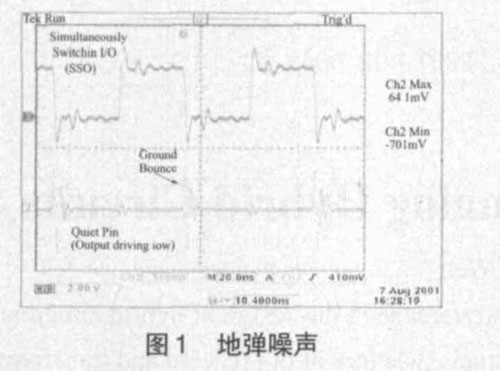 模擬信號(hào)與數(shù)字信號(hào)相比,對(duì)噪聲的敏感程度要大得多,因?yàn)槟M電路的工作依賴連續(xù)變化的電流和電壓,任何微小的干擾都能影響它的正常工作,而數(shù)字電路的工作依賴在接收端根據(jù)預(yù)先定義的電壓電平或門限對(duì)高電平或低電平的檢測(cè),具有一定的抗干擾能力。但在混合信號(hào)環(huán)境中,數(shù)字信號(hào)相對(duì)模擬信號(hào)而言是一種噪聲源。數(shù)字電路工作時(shí),穩(wěn)定的有效電壓只有高低電平兩種電壓。當(dāng)數(shù)字邏輯輸出由高電壓變?yōu)榈碗妷海撈骷慕拥毓苣_就會(huì)放電,產(chǎn)生開(kāi)關(guān)電流,這就是電路的開(kāi)關(guān)動(dòng)作。數(shù)字電路的速度越快,其開(kāi)關(guān)時(shí)間一般也要求越短,當(dāng)大量的開(kāi)關(guān)電路同時(shí)由邏輯高電平變?yōu)檫壿嫷碗娖綍r(shí),由于地線通過(guò)電流的能力不夠,大量的開(kāi)關(guān)電流就會(huì)引起邏輯地電壓發(fā)生波動(dòng),我們稱為地彈。如圖1 所示。數(shù)字電路造成的地彈噪聲和電源擾動(dòng),如果耦合到模擬電路中,就會(huì)影響模擬電路的工作性能。由于相當(dāng)多的干擾源是通過(guò)電源和地總線產(chǎn)生的,其中地線引起的噪聲干擾最大,所以在PCB 設(shè)計(jì)時(shí)對(duì)地和電源的設(shè)計(jì)就顯得尤為重要。