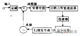 現(xiàn)在所用的頻譜分析儀多為超外差式,并采用多次變頻(3~4次),以降低中頻頻率,實現(xiàn)窄通帶和高分辨力。超外差式頻譜分析儀的基本工作原理如圖 1所示。輸入信號與本振(LO)混頻,產(chǎn)生中頻(IF)信號經(jīng)窄帶中放被送到包絡檢波器,檢波器輸出信號被放大并使屏幕顯示產(chǎn)生垂直偏轉(zhuǎn),掃描發(fā)生器保證屏幕顯示的水平頻率軸和本地振蕩器調(diào)諧同步,它同時驅(qū)動水平偏轉(zhuǎn)調(diào)諧LO。