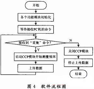 軟件的主要功能就是設(shè)置相關(guān)的功能模塊來(lái)配合硬件實(shí)現(xiàn)頻率的采集與數(shù)據(jù)的上傳,為了達(dá)到實(shí)時(shí)采集的目的,CCP模塊使用中斷方式進(jìn)行捕捉。測(cè)頻儀與PC機(jī)采用主從式通信,PIC18F452根據(jù)PC機(jī)發(fā)來(lái)的不同指令進(jìn)行相關(guān)的操作,指令共有兩種:開(kāi)始采集和停止采集。當(dāng)接收到“開(kāi)始采集”命令時(shí),PIC18F452就啟動(dòng)CCP模塊進(jìn)行頻率的測(cè)量并把測(cè)量結(jié)果通過(guò)串口上傳到PC機(jī);當(dāng)接收到“停止采集”的命令時(shí),PIC18F452就關(guān)閉CCP模塊,同時(shí)停止上傳數(shù)據(jù),然后繼續(xù)等待上位機(jī)的命令。測(cè)頻儀的軟件流程圖如圖4所示。