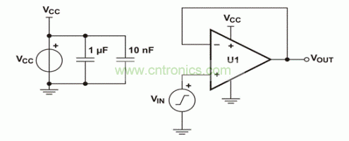 為了更好地理解超出VICMR帶來的影響,我們列舉出了一些此類違規(guī)的例子。我們選擇兩個(gè)不同VICMR規(guī)范的運(yùn)算放大器,以說明這些影響。我們之所以選擇這些器件,是因?yàn)樗鼈兙哂熊壍杰壿敵?,可排除輸出?jí)帶來的一些限制。圖3所示單電源電壓跟隨器電路,用于獲取兩個(gè)器件的波形。所有數(shù)據(jù)均在~25°C室溫下的實(shí)驗(yàn)臺(tái)獲取。