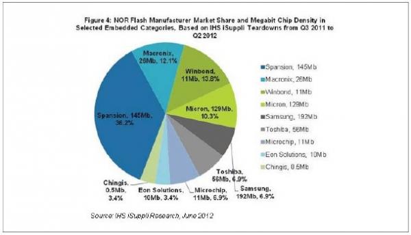 根據(jù)IHS iSuppli公司在三個季度內拆解分析的55個嵌入產(chǎn)品,這些產(chǎn)品中有三分之一以上的NOR芯片屬于美國Spansion Inc.,在所有供應商中處于領先地位,如圖所示。Spansion,以及韓國三星電子和美國美光,提供的NOR芯片平均密度為數(shù)百Mb。從2011年第三季度到今年第二季度,這三家公司占上述三個子領域中NOR芯片的53.4%。剩下的46.6%市場份額屬于生產(chǎn)100Mb以下密度NOR閃存的廠商。這類廠商包括臺灣旺宏電子和華邦電子等大型廠商,以及臺灣常憶科技和宜揚科技等規(guī)模較小的廠商。