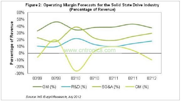 上次SSD產(chǎn)業(yè)出現(xiàn)營業(yè)利潤普遍為負(fù)的情況是在2010年上半年,與目前的情形類似。當(dāng)時(shí),幾家廠商加大銷售力度,以改善略高于35%的毛利率。這些努力取得了一些效果,2011年中期毛利率自2009年以來首次升到了40%以上。但由于產(chǎn)業(yè)競爭加劇和營業(yè)費(fèi)用增加,SSD毛利率在2011年第四季度重新跌至40%以下。