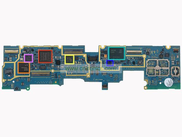 我們來看看主板上的一些重要部件:三星Exynos四核 1.4 GHz處理器,集成3D顯卡、Wacom公司W(wǎng)8008(可能用于S Pen的輸入)、Atmel mXT1664S觸摸屏控制器、三星KLMAG2GE4A NAND閃存、歐勝WM1811AE音頻編解碼器、F0514A 430 1201KP411