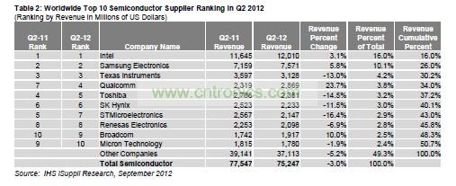 表2:2012年第二季度全球10大半導(dǎo)體供應(yīng)商排名 (按營收排名,單位是百萬美元)