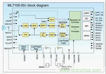 圖1:Bluetooth® LE LSI(ML7105-00x)的內(nèi)部結(jié)構