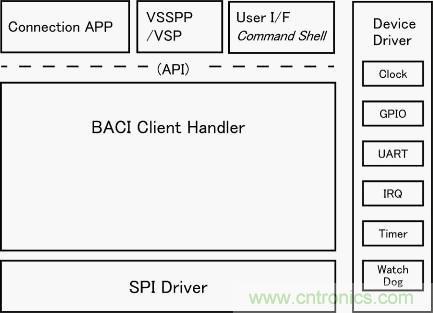 BACI通過簡化與主機之間的通信來降低訪問頻率。而且,在結(jié)構設計上采用通過事件使主機啟動的結(jié)構,因此,是盡可能使主機停動來抑制耗電量的設計。綜上所述,本LSI在整個結(jié)構模塊上進行了降低耗電量的設計,從而,使紐扣電池驅(qū)動3年以上連續(xù)工作成為可能。主機和堆棧結(jié)構如圖2所示。