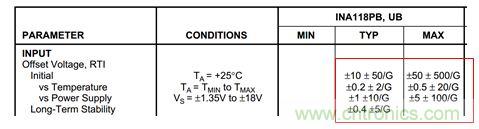 在儀表放大器產(chǎn)品說明書中可找到該公式,從而可計算出由溫度、電源和共模電壓等不同因素所引起的輸入失調(diào)變化值: