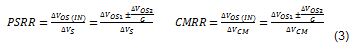PSRR 和 CMRR 定義為輸入失調(diào)電壓變化 ΔVOS(IN) 與電源電壓變化 ΔVS 或共模電壓變化 ΔVCM 的比值。