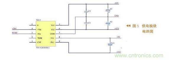 其中,采用24T05D12模塊電源作為供電電路的主芯片,提供的功率為30W,輸入電壓范圍為18V~36V,具有三路電源輸出:+5V和±12V,為機(jī)載傳感器和舵機(jī)進(jìn)行供電。