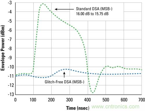 IDT公司通過開發(fā)Glitch-Free(無干擾)技術(shù)還克服了一個(gè)影響數(shù)字步進(jìn)衰減器的重要缺陷。Glitch-Free技術(shù)降低了眾所周知發(fā)生在MSB態(tài)從10dB轉(zhuǎn)變到0.5dB時(shí)出現(xiàn)的瞬態(tài)過沖。在發(fā)射器等精密電平設(shè)置環(huán)境下,該技術(shù)可確保增益平滑地過渡到相鄰的設(shè)置。從歷史經(jīng)驗(yàn)看,較大的10dB干擾(glitch)已經(jīng)能夠損害下游的功率放大器。此外,傳統(tǒng)的DSA需要很長的時(shí)間實(shí)現(xiàn)穩(wěn)定,這可降低時(shí)域雙工(TDD)系統(tǒng)的處理性能(turnaround performance)。通過近乎消除這種過沖,Glitch-Free技術(shù)顯著提高了系統(tǒng)的可靠性,并允許實(shí)現(xiàn)更靈活的TDD系統(tǒng)。