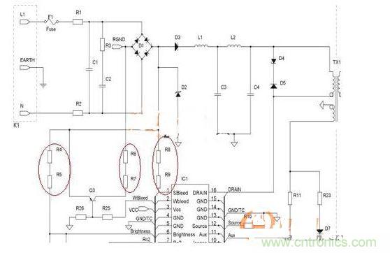 再來看上面的電路,如果我們把R4和R5合并成一個1/4W 1M的插件電路,功率上講是沒有問題的,但是230V交流通過整流橋后可以產(chǎn)生最高325V的直流電壓,這樣就會讓這個電阻長時間工作在300V左右的電壓下,時間一長,就會損壞這個電阻,但如果是用兩個510K的電阻串聯(lián),每個電阻只分到大約150V的電壓,就可以保證電路長時間穩(wěn)定工作。