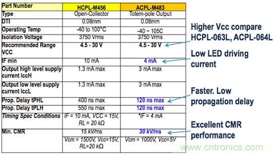 圖7b:Micro850中使用的HCPL-M456光耦的輸出隔離特性,并與較新版本的ACPL-M483器件進(jìn)行了比較,結(jié)果表明前者具有更小的LED驅(qū)動(dòng)電流、更快的傳播速度和改進(jìn)的共模抑制性能(CMR)。