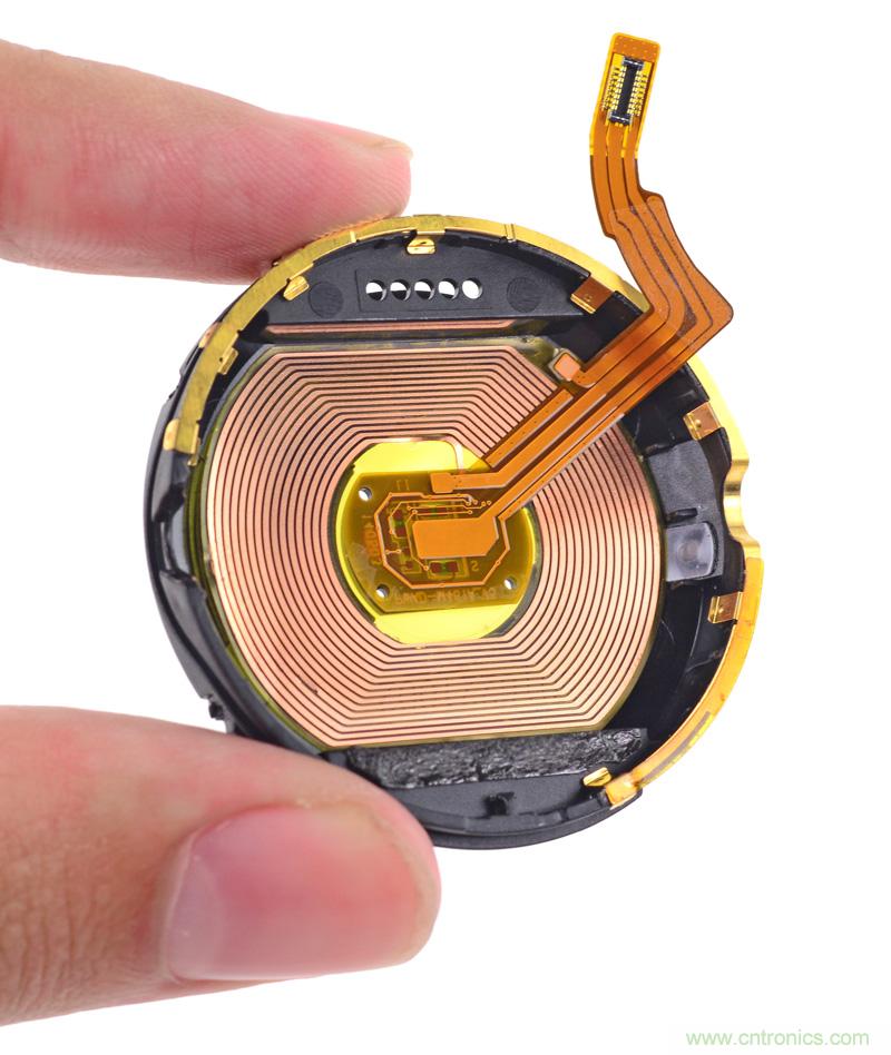 下面讓我們來更仔細地觀察后外殼。我們已經知道,它含有光學體積描記術傳感器。但你也可能已經明白,Moto 360是一種只能無線充電的設備,確切地說通過的是Qi感應式電力傳輸標準。撕掉屏蔽電路板以阻止任何錯誤能量的標簽紙,就能清晰看到下方的無線接收線圈了。