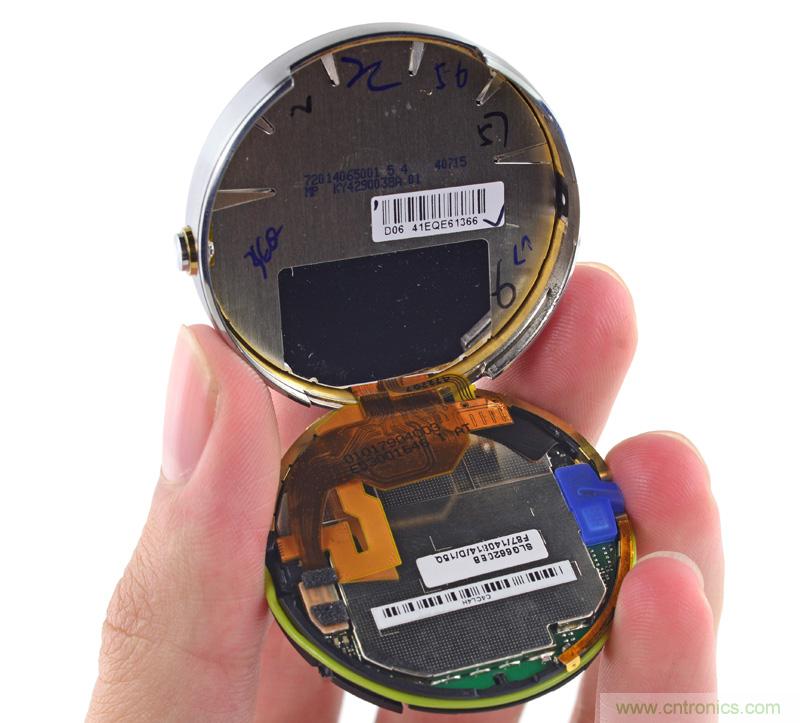前面詳細介紹了PCB部分,下面讓我們把注意力轉向顯示屏。上面就是顯示屏的兩張照片以及與顯示屏配套的排線和其它電路。雖然其它智能手表使用電子墨水(Pebble)或OLED(蘋果手表和其它Android Wear手表)顯示技術,但摩托羅拉采用的是圓形LCD。我認識到摩托羅拉的LCD選擇是有優(yōu)勢的,這體現(xiàn)在與更常見(但容易褪色)的OLED顯示屏相比可以在很亮的環(huán)境光線下觀看顯示屏,以及與電子墨水的單色或“彩色”顯示屏相比可以提供更加豐富的亮度和色度。但LCD的主要缺點是耗電的背光燈,這點不可忽視。