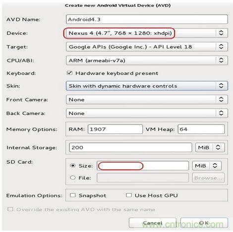 如上圖所示,選擇Nexus 4和合適的Target(安卓4.3:API 18,安卓2.2:API 8 )。在皮膚(Skin)選項(xiàng),請(qǐng)選擇皮膚與動(dòng)態(tài)硬件控制(Skin with dynamic hardware controls)。其他選項(xiàng)就不用更改了,默認(rèn)設(shè)置就好。不過在SD卡選項(xiàng)上,請(qǐng)?jiān)O(shè)定為100MiB。