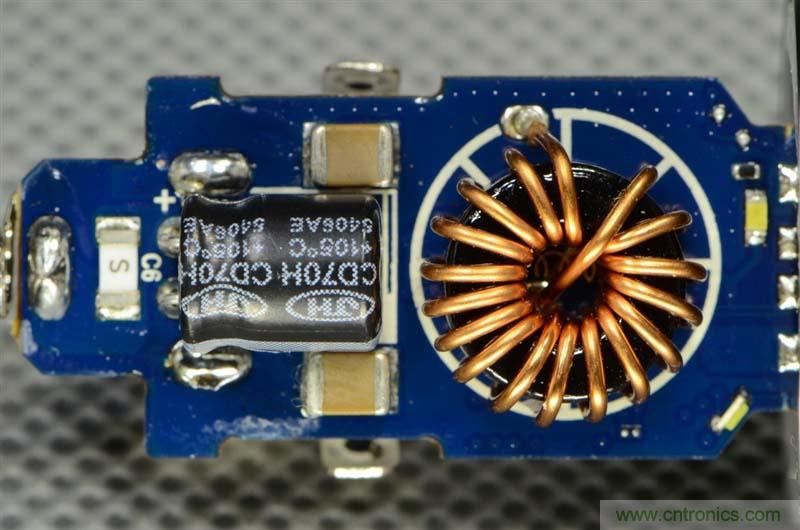 電路板一側,可以看到一個濾波電解電容和一個大的電感,還有幾個貼片電容,標記為S的白色元件為保險絲。