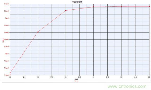 第2個實例是在20GHz載波頻率和4GHz調制帶寬驗證了系統(tǒng)級吞吐率,信號載波頻率為20GHz,調制帶寬為4GHz,調制方式為FBMC 16QAM,AWGN信道,信噪比從10-35dB變化,圖8所示為系統(tǒng)級吞吐率Throughput與信噪比SNR的關系曲線,可以看到吞吐率Throughput約為7.4Gbps到9.3Gbps