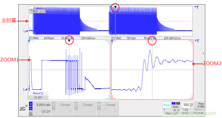 如上圖,在捕獲較長時間的波形后,如何對PWM驅(qū)動信號或異常信號進行分析呢?另外,在工業(yè)伺服應(yīng)用方面,在不同的工況下,在切換不同負(fù)載的時候,對應(yīng)不同時間的驅(qū)動器波形變化或出異常信號,整個負(fù)載切換到穩(wěn)定的過程時間較長,也需要在大存儲深度下,觀看波形細(xì)節(jié),針對上述情況,ZDS4000系列示波器在保證大存儲深度的情況下,支持雙ZOOM縮放模式,可以為兩個縮放窗口分別設(shè)置系數(shù),配合智能標(biāo)注功能,對任意處感興趣的信號進行標(biāo)注。圖中為對PWM驅(qū)動信號,主時基內(nèi)的波形在兩個ZOOM窗口分別放大,ZOOM1為PWM周期信號,ZOOM2為PWM某一尖峰的振蕩波形,在大存儲深度的保證下,采樣率50M Sa/s,保證了波形細(xì)節(jié)的真實性。同時,配合智能標(biāo)注功能,如在主時基上做一標(biāo)注,在ZOOM1、ZOOM2上能夠快速找到標(biāo)注點,可看到ZOOM1中標(biāo)注點——PWM的第3個尖峰,在ZOOM2中可查看到尖峰的振蕩情況及幅值。