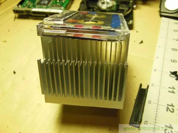 到目前為止,頭是最有挑戰(zhàn)性的一部分。我希望機(jī)器人的外表在具有復(fù)古風(fēng)格的同時,還能讓人在看到它的第一眼就知道它的功能與聲音有關(guān)。我發(fā)現(xiàn)一盒舊磁帶的大小與電腦散熱片的大小差不多。散熱片也可以用來做機(jī)器人的頭,因為它大部分地方是空的,能夠輕易地在里面接線從而給它焊電燈泡??峥岬臋C(jī)器人怎么可以不亮呢?