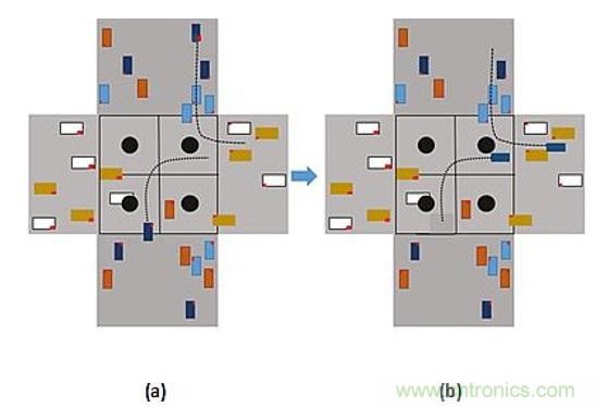 圖7:(a)計算得到的經過減速后的行駛軌跡;(b)碰撞最終是如何避免的。