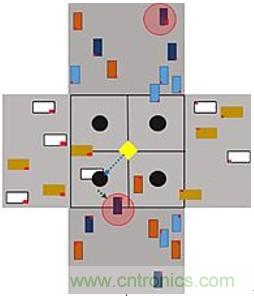 所有這些信息都將從這些雷達收發(fā)器發(fā)送到所有雷達部件共用的子系統(tǒng)中的中央處理單元(CPU)(圖4)。這個CPU將執(zhí)行計算,并找出兩輛(或更多輛)來自不同方向但想要進入相同車道并因此可能發(fā)生碰撞的汽車。利用汽車的距離和速度數據,并使用預先饋入的交叉路口處汽車的一般轉向軌跡線數據,CPU就能預測出任何可能的碰撞(圖5)。在判斷出這些即將碰撞的汽車后,CPU將指揮其中一輛車減速。為了實現這個功能,CPU會將這個信息傳送給相關的雷達子系統(tǒng),雷達子系統(tǒng)再使用Wi-Fi信號將這個信息發(fā)送給目標汽車(圖6)。當其中一輛車按要求減速后,碰撞就得以避免了(圖7)。雖然這個系統(tǒng)最適合自動駕駛汽車,但也能很好地支持同樣聯網的人工駕駛汽車。