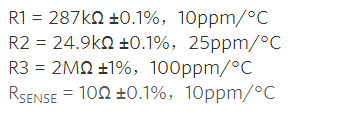 從表2可知,當(dāng)R1、R2、R3和RSENSE的溫度系數(shù)取以下值時(shí),得到的誤差為0.05% FS。