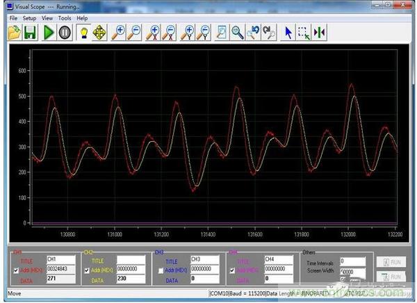 LDO本身的電壓輸出非常穩(wěn)定,由于筆者ADC采樣為10位,在手指未放入傳感器時,電壓值幾乎保持在3/1024以內(nèi)跳動。所以筆者默認這款LDO能達0.3%以下的精度。下圖便是筆者關(guān)于LDO給模擬部分供電后的心率采樣波形。紅色為一階低通濾波前的波形,黃色為低通濾波后的波形。對實時性要求不高的系統(tǒng)來說,這樣的模擬量波形已經(jīng)能夠滿足項目的需求。