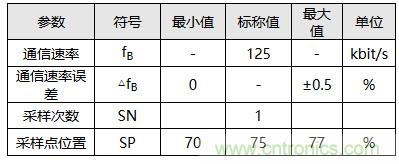 例如某著名車廠CAN通信標(biāo)準(zhǔn)里規(guī)定,通信速率為125 kbps時(shí),應(yīng)該采用單次采樣,采樣點(diǎn)位置設(shè)置在70%~77%之間。其位定時(shí)參數(shù)取值可見(jiàn)表1與表2。