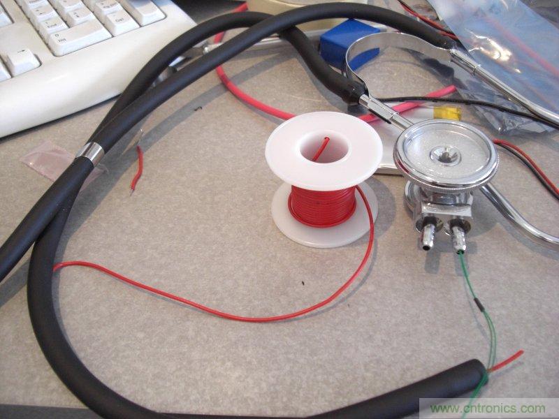 把電線焊到這個(gè)小家伙身上。請(qǐng)用膠帶固定好麥克風(fēng),我使用30AWG的繞線將電線穿過(guò)聽(tīng)診器的柔性管。
