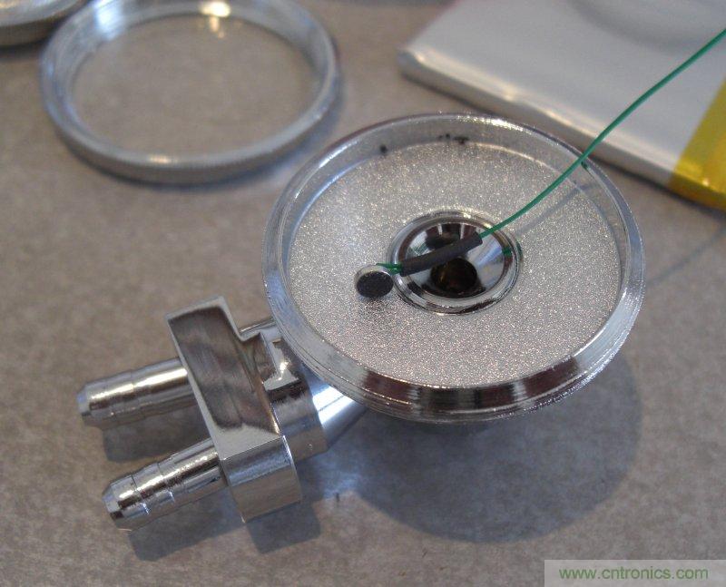 置入聽(tīng)診器的RF板必須盡可能小,它由一個(gè)小型鋰聚合物電池供電,只是用來(lái)讀取麥克風(fēng)上的模擬電平信號(hào)以捕捉心跳,然后將信號(hào)無(wú)線傳輸給緊身夾克上的接收器。