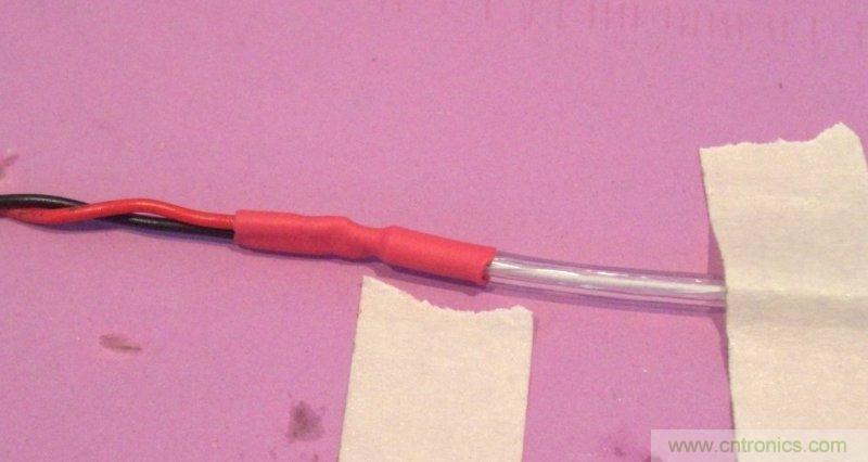為防止出錯(cuò),我用紅線連接所有內(nèi)芯,用黑線連接所有發(fā)絲。切記:在焊接之前務(wù)必先給紅線和黑線套上熱縮管! 我在焊接時(shí)用膠帶來(lái)固定所有東西,一切都很順利。