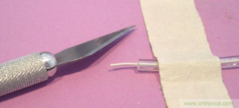 使用一個(gè)小刀從內(nèi)芯刮去熒光粉,從上圖可以看到有兩根像頭發(fā)絲一樣的線。