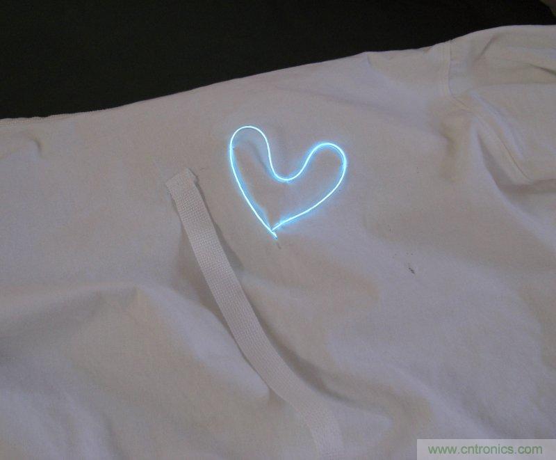 接下來(lái)就是用EL線制作出五個(gè)心形圖案。 這需要花點(diǎn)功夫,如果你從來(lái)沒(méi)有搞過(guò)EL線,就耐心跟著下面的步驟來(lái)吧。在動(dòng)手之前,要先考慮如何將EL線連接到控制器上。我建議使用JST 2針的摩擦連接器,采用這種JST連接,可以快速方便地從衣服上拆除EL線和控制器。