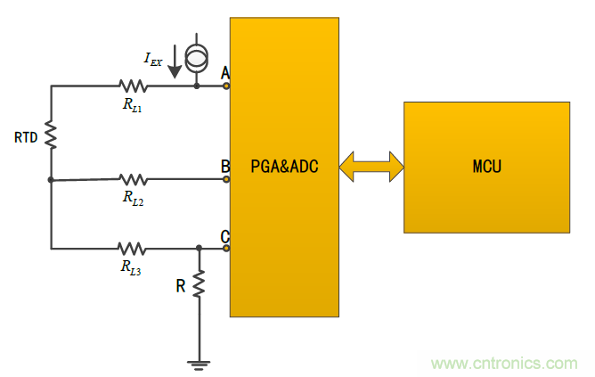如圖2,三線制接法采集電壓信號(hào),由后端PGA提供增益放大,經(jīng)ADC模數(shù)轉(zhuǎn)換,輸出數(shù)字信號(hào)給MCU處理,由于A,B,C三線均存在線阻抗RL1,RL2,RL3。這里可以通過安裝標(biāo)準(zhǔn)三線制PT100,可保證: