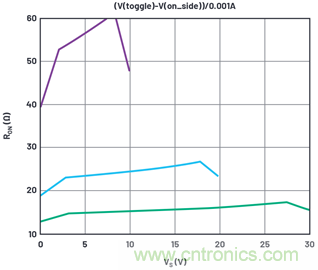 來看一下圖1中我們想要再現(xiàn)的ADG333A RON曲線。