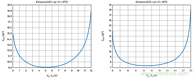 圖13. VS = 12 V(左側(cè))和30 V(右側(cè))下的關(guān)閉電容和直流電壓關(guān)系曲線。